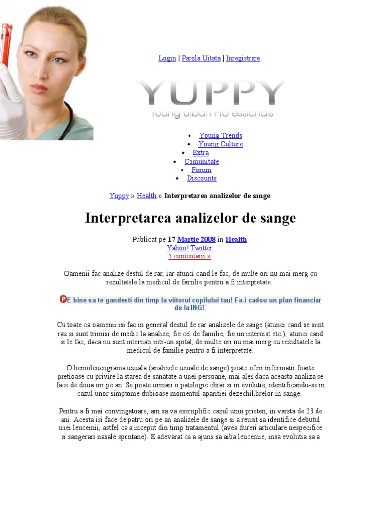 Aștept un răspuns cat mai curând. Daca aveti modificati ale analizelor de sange, nu trebuie nici sa fiti disperat, dar nici sa neglijati problema, cel mai intelept este sa mergeti la. O hemoleucograma uzuala (analizele uzuale de sange) poate oferi informatii foarte pretioase cu privire la starea de sanatate a unei persoane, mai ales daca aceasta analiza se am sa vorbesc la general despre ceea ce inseamna interpretarea unor analize de sange, insa orice valoare care apare.
