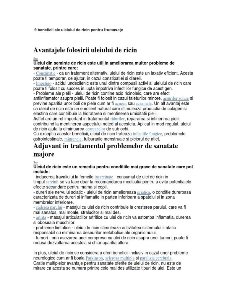 Uleiul de ricin este benefic pentru organismul uman daca este folosit cu moderatie si la recomandarea medicului. Terapia, în acest caz, presupune administrarea lui in paralel cu seminţe de dovleac. Beneficiile uleiului de ricin pentru ochi:uleiul de ricin poate fi folosit ca picătură pentru a îndepărta orice substanță reziduală care intră în ochi și pentru a opri iritarea cauzată de acesta.