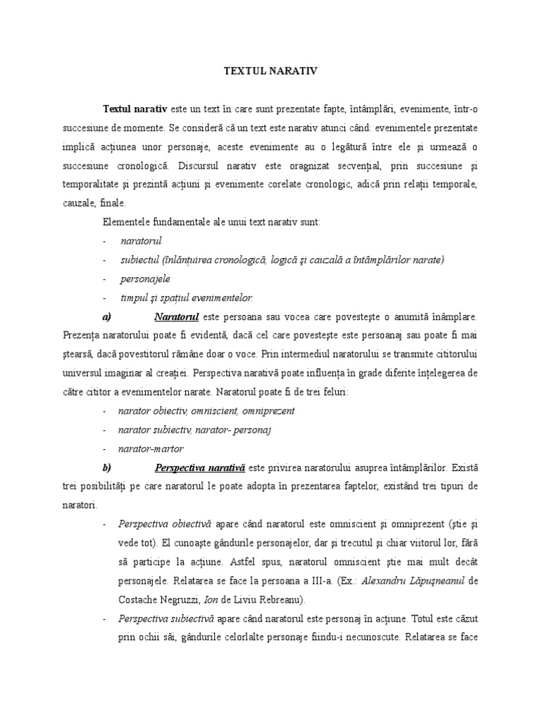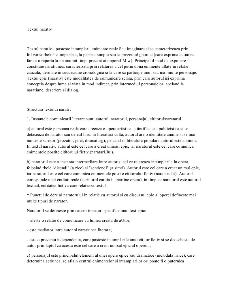vizitati articolul complet aici : https://www.slideshare.net/AlinutzaElen/manual-a-5-a Textul narativ este tipul textual care spune o serie de fapte, fie ele reale sau imaginare, unde personajele acționează textul narativ are, de asemenea, caractere, care sunt cele care alcătuiesc povestea fiind spusă. Textul narativ este acel text unde se narareaza (se povesteste )ceva. Receptarea textului literar opera de artă este creată pentru a fi receptată, caracteristică ce scoate în evidență importanța acestui proces complex în contextul studierii literaturii în școală.