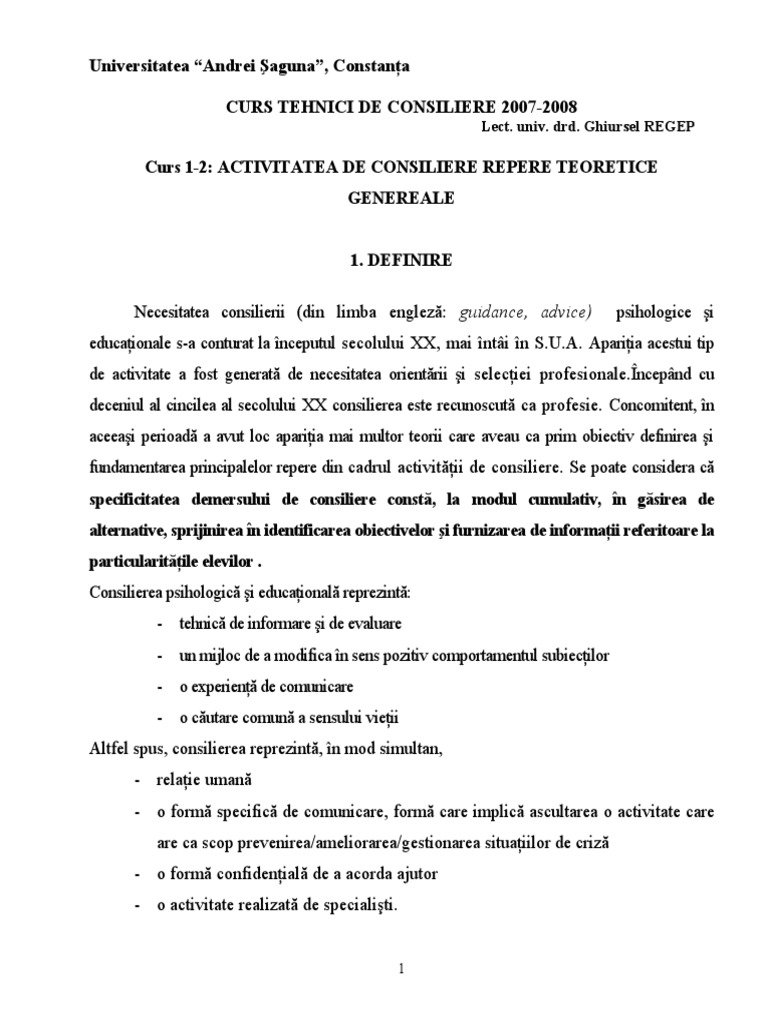 interviul psihoterapeutic psihoterapeutic ca proces decizional definirea clara a problemei clientului ♦ elaborarea unor alternative n. Consilierea se concentreaza pe aspecte privind autocunoasterea si dezvoltarea optima a resurselor proprii. Consilierea psihologică contribuie la atent clientul care povestește despre dificultățile sale cotidiene, exprimă empatie maximă, sinceritate absolută, îngrijorare, nu recurge la tehnici de evaluare și manipulare.